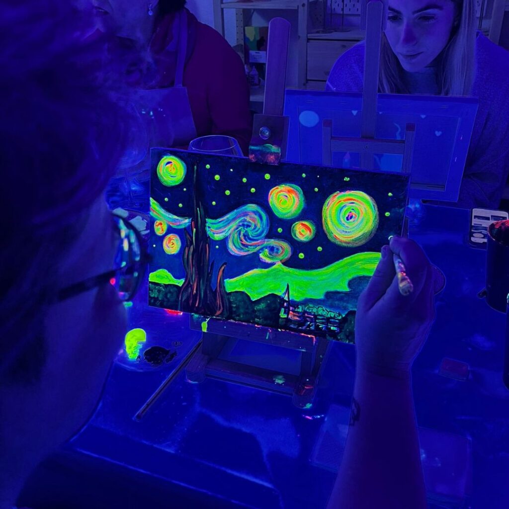 Neón Art para niñas y niños a partir de 7 años. Precio: 12€ (o 9€ con bono de actividades). 1 turno disponible: